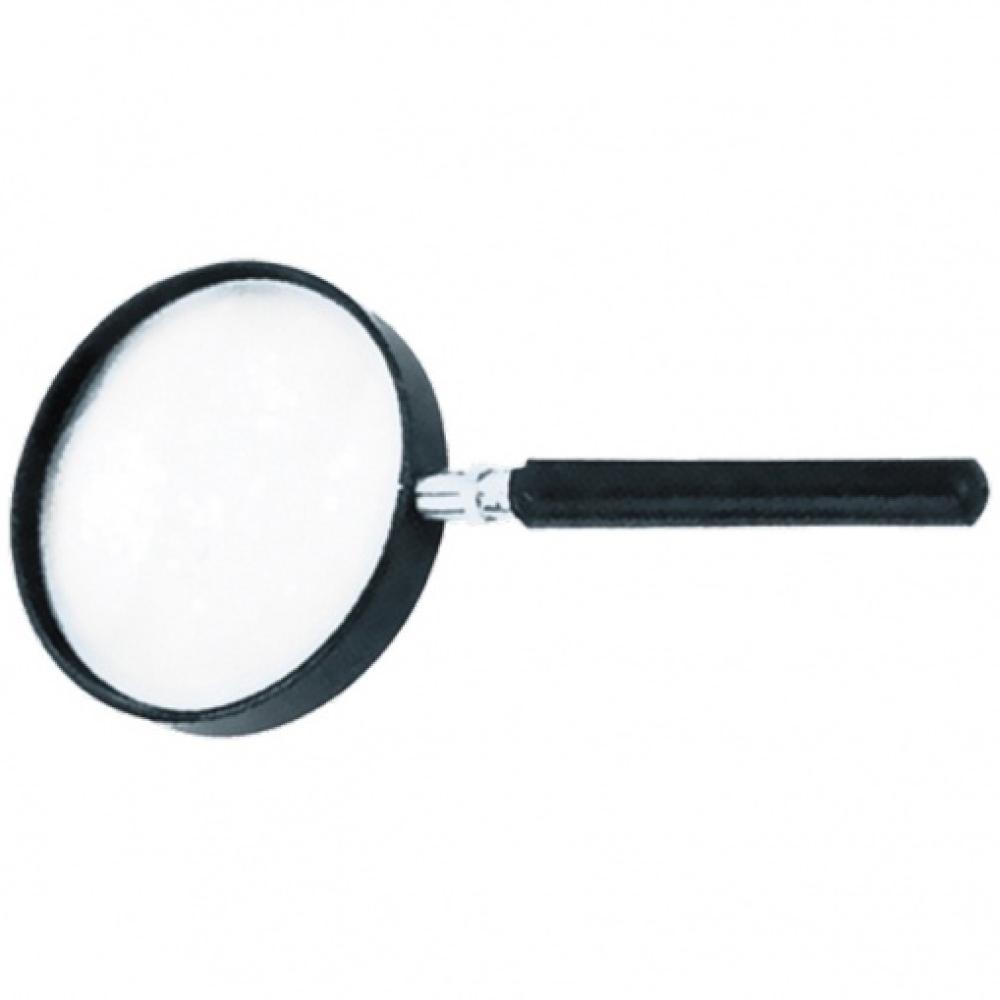Классическая лупа в металлической оправе с пластиковой ручкой.