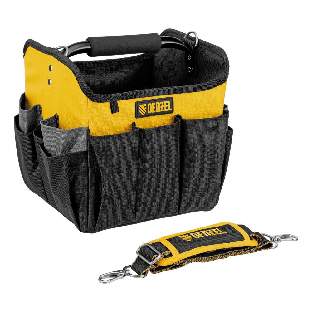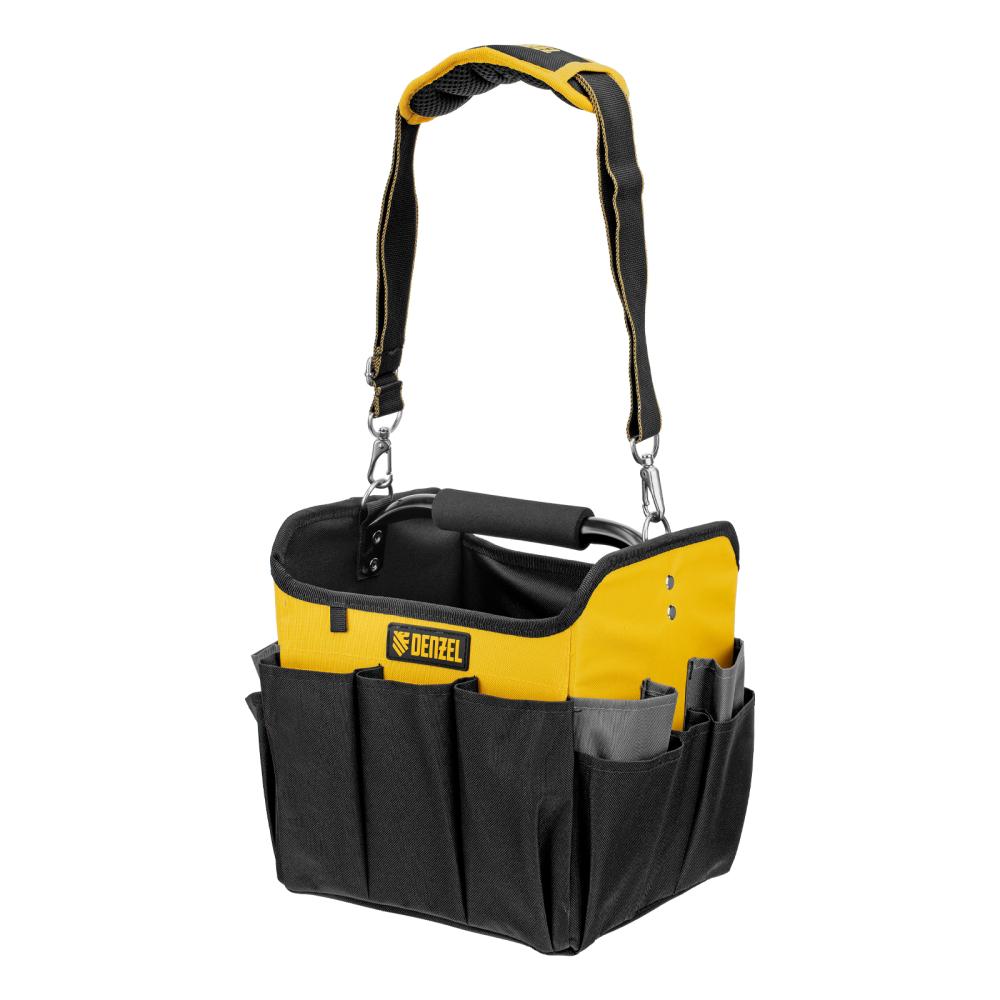 Переноска Denzel 90294 габаритами 260 х 240 х 300 мм, с наплечным ремнем, имеет вместительное основное отделение и 22 кармана. В ней можно разместить ручной и электроинструмент для хранения и транспортировки. Переноска пригодится в дороге, дома или в гараже.