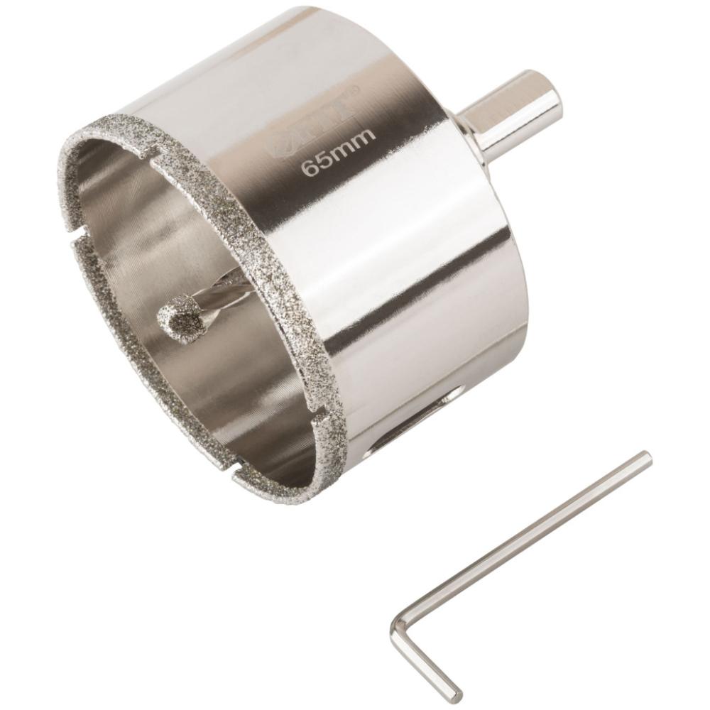 Трехгранный хвостовик. Идут в комплекте с центрирующим сверлом и шестигранным ключом. Для вырезания круговых отверстий в керамограните, камне, стекле, кафельной плитке. Влажное сверление. Глубина пропила 40 мм. Материал: инструментальная сталь, режущая кромка содержит порошок из технических алмазов. Упаковка: блистер.