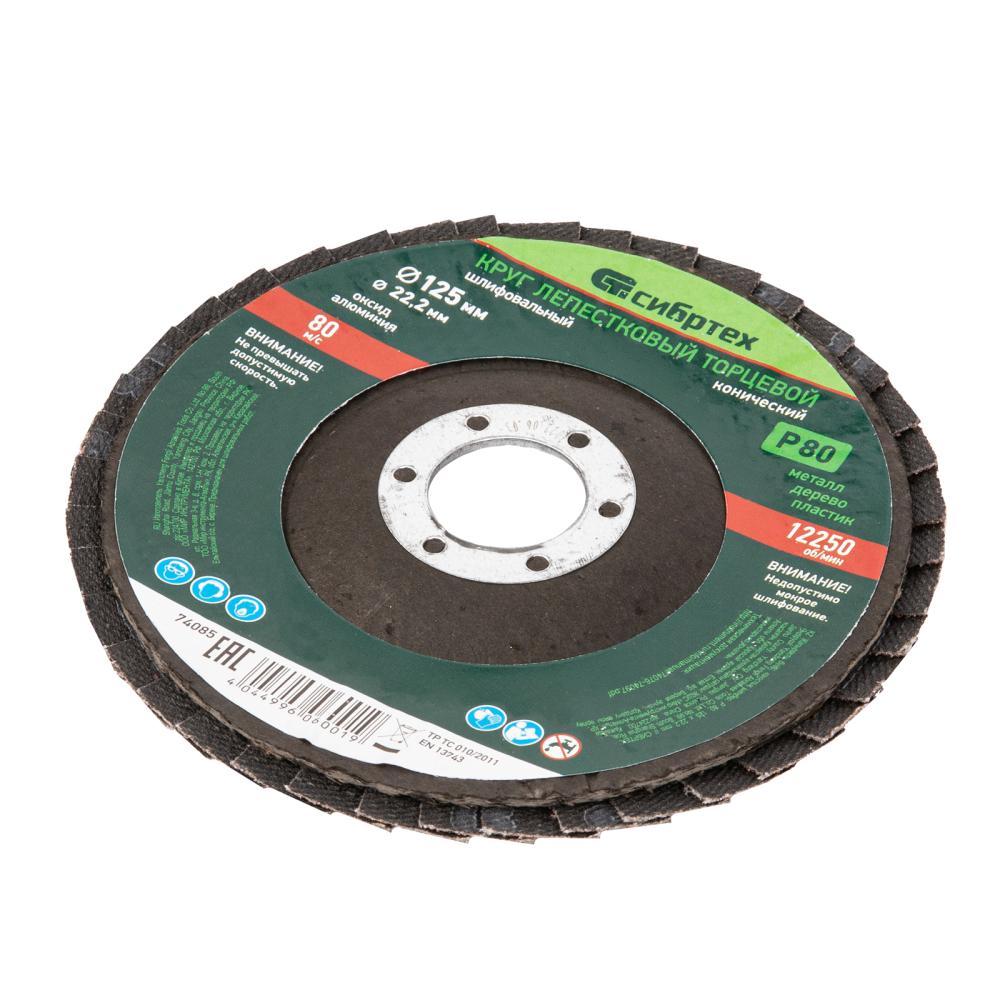 Круг лепестковый торцевой конический Сибртех 74085 размером 125 х 22,2 мм, с крупнозернистым абразивом Р80, устанавливается на углошлифовальные машины с соответствующим посадочным диаметром. Используется для промежуточной обработки, торцевого и плоского шлифования древесины, металла, пластика. С помощью круга можно выполнить зачистку сварных швов, подготовить поверхность к чистовой шлифовке, удалить заусенцы, снять краску, лак, ржавчину и т.д.