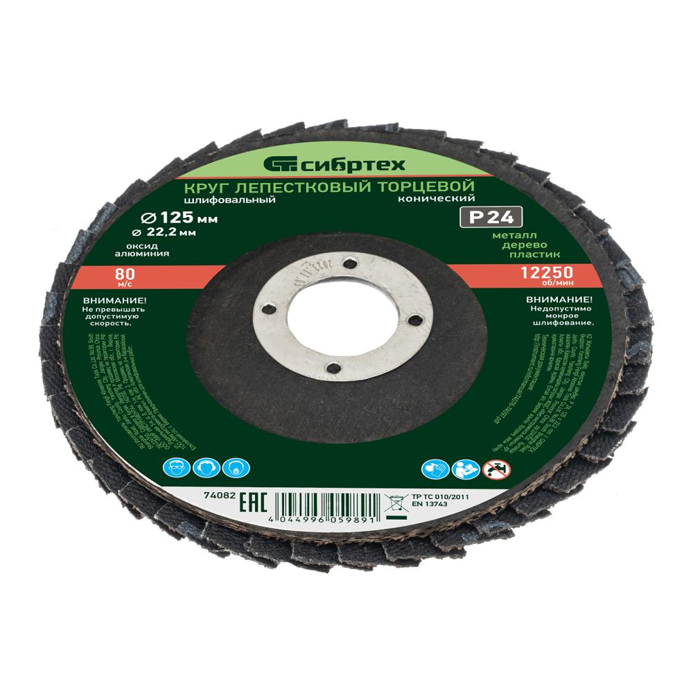 Круг лепестковый торцевой конический Сибртех 74082 с крупнозернистым абразивом Р24, 125 х 22,2 мм, устанавливается на углошлифовальные машины с соответствующим посадочным диаметром. Он используется для грубой (черновой) обработки, торцевого и плоского шлифования древесины, металла, пластика. С помощью него можно выполнить первичную зачистку сварных швов, убрать грубые дефекты, толстый слой ржавчины и краски и т.д.