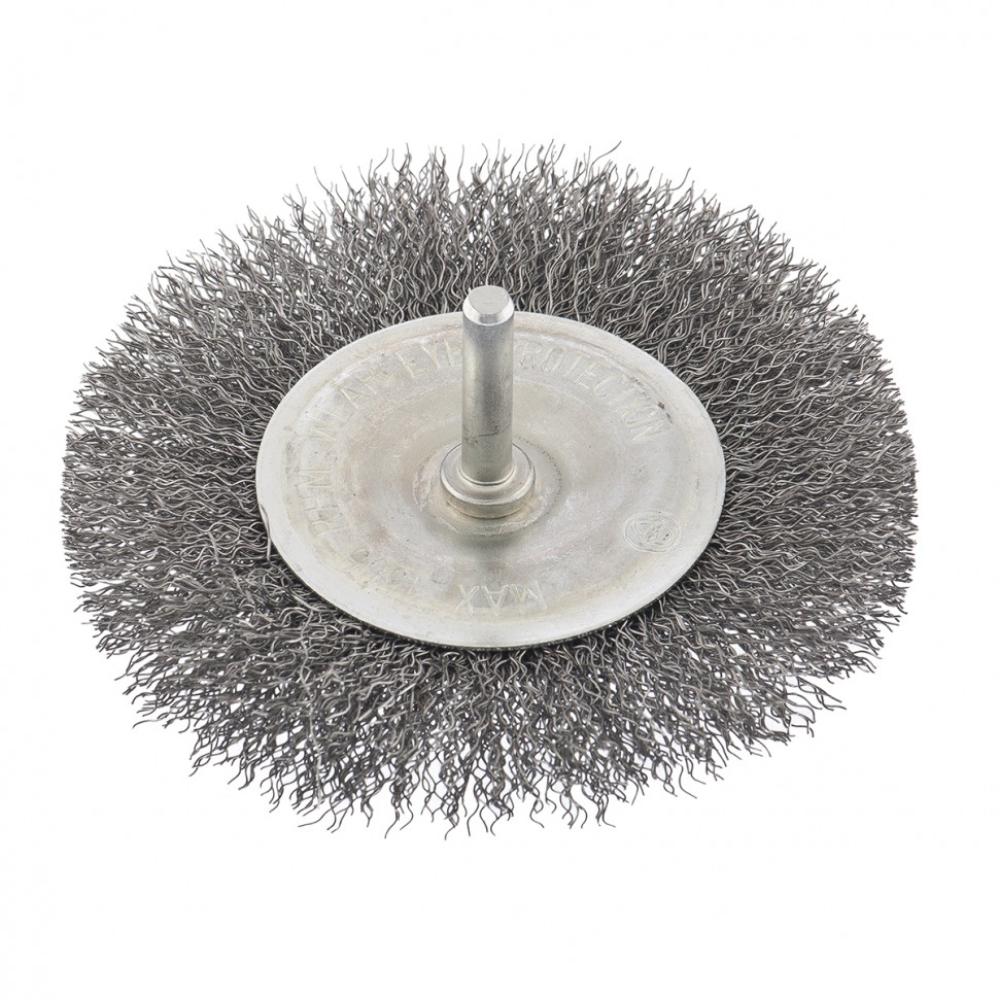 Плоская щетка для дрели Сибртех 744507 диаметром 100 мм, со шпилькой, с щетиной из витой проволоки 0,3 мм, используется для щадящей обработки металлических, деревянных и пластиковых поверхностей. Удаляет загрязнения, ржавчину, старые лакокрасочные покрытия. Благодаря плоской форме щетка идеально подходит для очистки труднодоступных мест, пазов, изгибов, внутренних углов. Хвостовик диаметром 6 мм устанавливается в патрон дрели. Рекомендуемая скорость вращения 4500 об/мин. Во время работы следует использовать средства индивидуальной защиты. Щетку применяют во время строительства, ремонта, а также в быту.