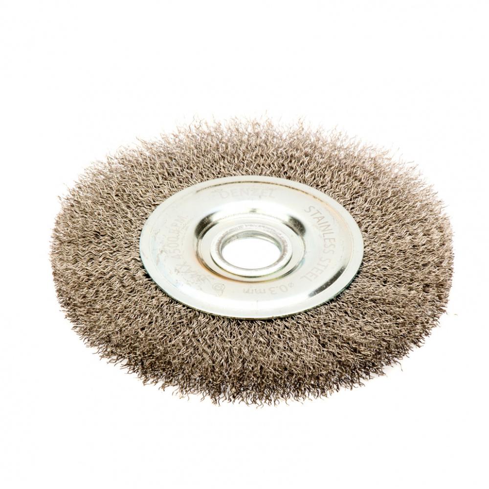 Плоская щетка для УШМ Denzel 746643 диаметром 150 мм, с щетиной из витой нержавеющей проволоки 0,3 мм, с посадкой 22,2 мм, постепенно снимает тонкий слой материала, поэтому ее используют для щадящей обработки металлических, деревянных, пластиковых поверхностей, а также изделий из нержавеющей стали. Щетка удаляет ржавчину, загрязнения, остатки лакокрасочных покрытий из труднодоступных мест, пазов и углов. Оснастка с посадкой 22,2 мм устанавливается на фланец углошлифовальной машины, что удобно для длительной работы без смены насадок. Рекомендуемая максимальная скорость вращения составляет 4500 об/мин. Во время работы следует использовать средства индивидуальной защиты. Щетку применяют в строительстве, машиностроении, а также в быту.