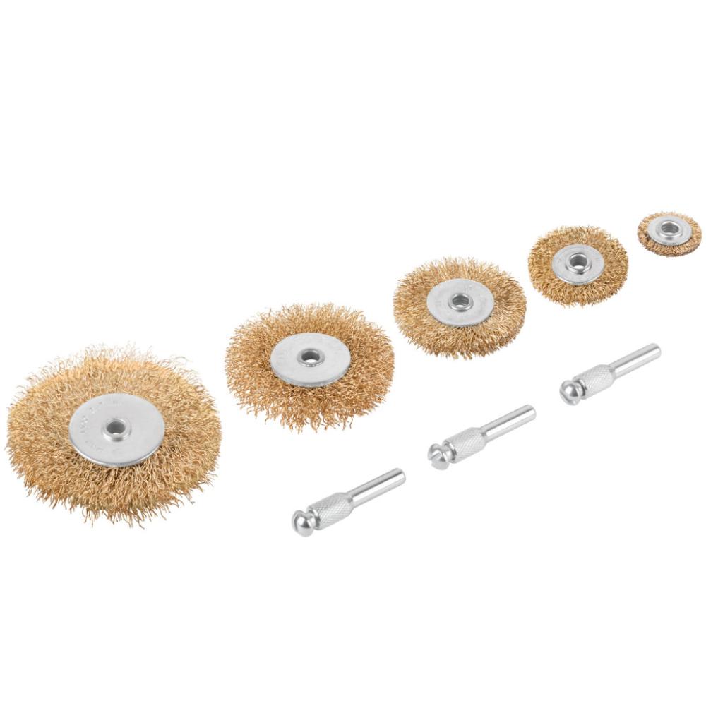 Набор 5 шт. (колеса 25 / 38 / 50 / 63 / 75 мм). Материал: стальная, латунированная, волнистая проволока. 3 стальных штифта для установки корщётки на дрель. Упаковка: блистер.