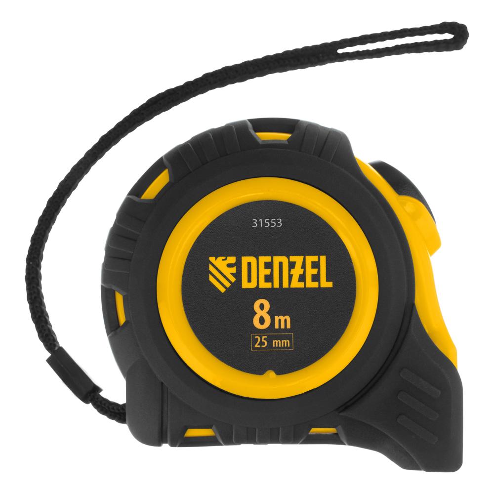 Рулетка Denzel 31553 в обрезиненном корпусе, с автоматической фиксацией, с полотном шириной 25 мм и длиной 8 м, используется для измерения расстояний и размеров предметов. Стальная лента с эмалевым покрытием и защитной пластиной в месте крепления зацепа рассчитана на долгий срок службы. Рулетка будет полезна во время строительства и ремонта, а также пригодится в быту.