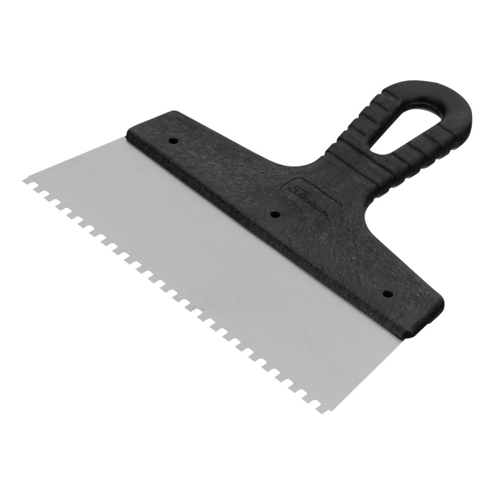 Шпатель Сибртех 85456 шириной 200 мм, из нержавеющей стали, с пластмассовой ручкой и зубьями 4 х 4 мм, применяется для равномерного нанесения клея при укладке мелкоформатной плитки, мозаики и т.д. Квадратные зубья облегчают нанесение клеевого состава, позволяя ровно и экономно распределять его по поверхности. Зубья размером 4 х 4 мм рассчитаны на плитку площадью 50-100 см2.