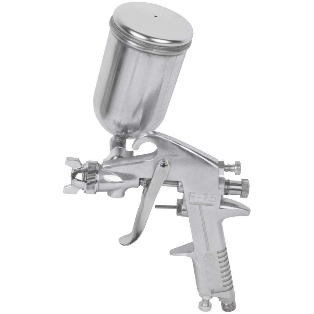 рабочее давление 3,5 - 5 бар, ширина факела 110-180 мм. Материал: алюминий. Для пневмокомпрессора. Cоединение байонет. С алюминиевым верхним бачком. Возможность регулировки: факела, расхода краски, потока подачи воздуха, угла установки бачка. Используется с: водоэмульсионными красками, синтетическими эмалями, полиуретановыми эмалями, эпоксидными эмалями, нитроэмалями.