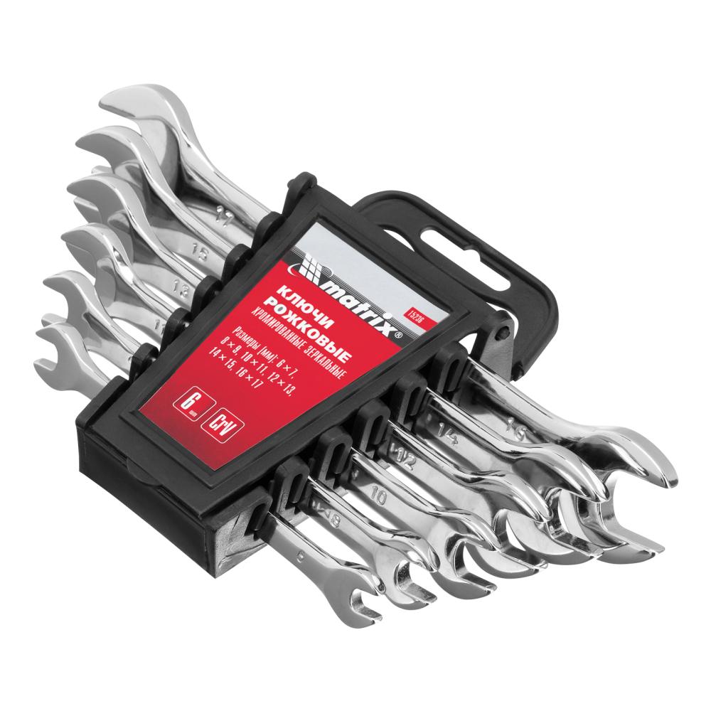 Набор Matrix Elliptical 15236 включает в себя 6 рожковых ключей из стали CrV с зеркальным хромированием и предназначен для закручивания и откручивания резьбовых соединений с шестигранным профилем и размером головки от 6 до 17 мм. Ключи удобны для манипуляций в ограниченном пространстве, т. к. у каждого из них губки расположены под углом к рукоятке. Набор будет полезен при проведении монтажных, сантехнических работ, для ремонта автомобилей или бытовой техники, также пригодится в быту.