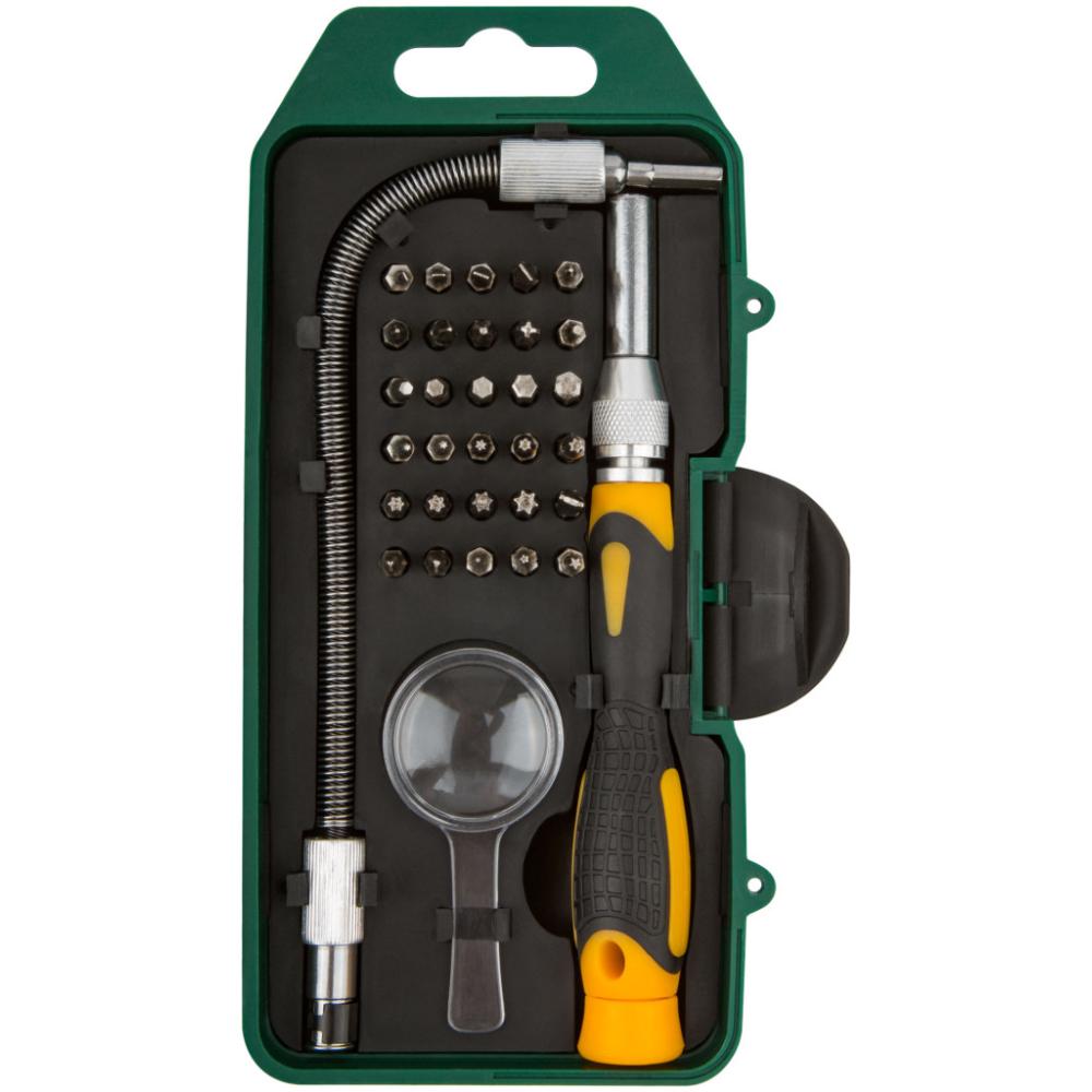 Для точных работ. В наборе: биты: 30 шт. SL1.5, SL2, SL2.5, SL3; PH000, PH00, PH0, PH1, PH2; T4, T5, T6; Torx с отверстием Т7, T8, T9, T10, T15, T20; Н1.5, H2, H2.5, H3, H4, H4.5; Y-тип Y0, Y1; U-тип U3; Pentalobe P0.8, P1.5, P2. Стекло увелечительное. Переходник гибкий, 190 мм. Материал: хром-ванадиевая сталь, пластиковая прорезиненная ручка.Упаковка: пластиковый футляр.