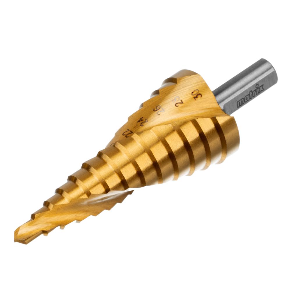 Ступенчатое сверло Matrix 72357 из стали HSS, со спиральным профилем и трехгранным хвостовиком, позволяет получать отверстия диаметром 6-8-10-12-14-16-18-20-22-24-26-28-30 мм в материалах толщиной до 5 мм: стали, цветных металлах, нержавейке и пластике. Благодаря плавному ступенчатому переходу и возможности сразу снять фаску отверстие получается аккуратным и имеет ровные края.