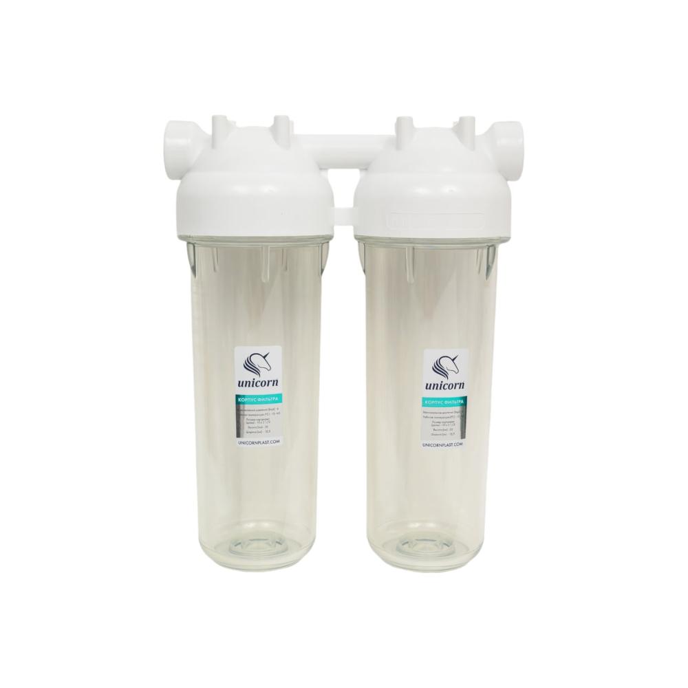 Магистральный фильтр Unicorn 3/4\'\' KSBP DUO двойной, для холодной воды, прозрачный 10" 548621 имеет обновленную форму корпуса, усиленную латунную вставку и обладает повышенными прочностными характеристиками.