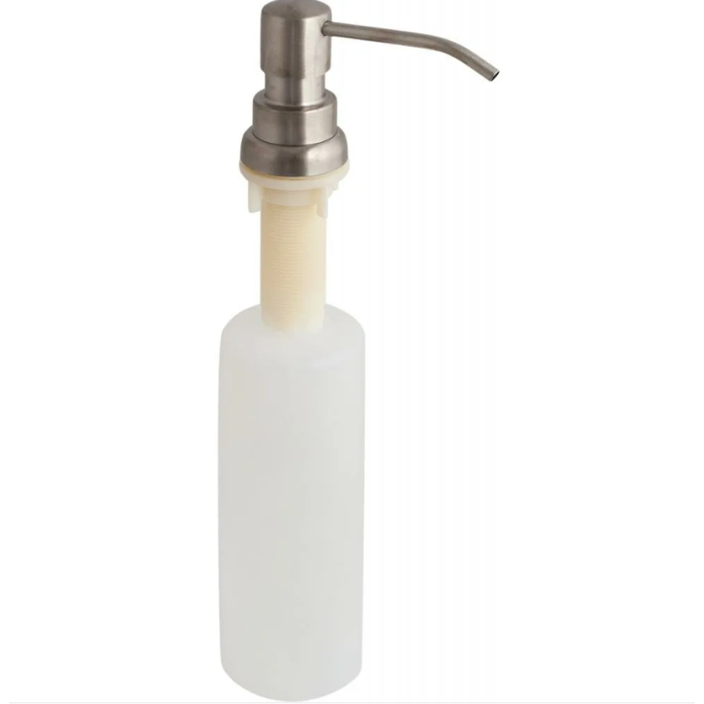 Врезной дозатор для жидкого мыла встраивается в мойку или в столешницу возле нее. Емкость со средством скрыта под поверхностью, сверху остается лишь носик устройства. Дозатор можно заправить не только мылом, но и гелем для мытья посуды. Материал емкости: пластик.