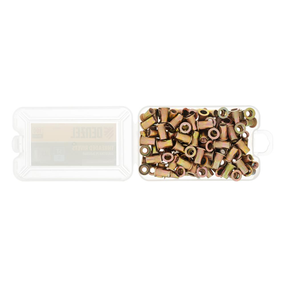 Стальные резьбовые заклепки Denzel 40602, с резьбой M5, оцинкованные, предназначены для скрепления листовых материалов толщиной 0,5-2,5 мм. Совместимы с заклепочником Denzel 40501. Позволяют получить резьбовое соединение даже при одностороннем доступе к месту крепления. Крепежные элементы используются для проведения строительных и монтажных работ, пригодятся на даче и в гараже.
